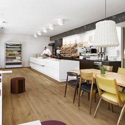 Der aus hygienetechnischen Gründen ursprünglich geflieste Boden wird durch massives Eichenparkett ersetzt. Er bringt einerseits einen wohnlichen Charakter in den Raum,