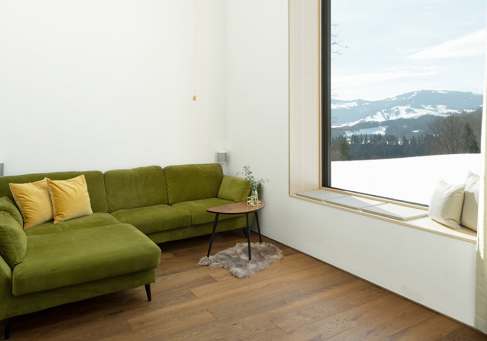 In drei Himmelsrichtungen steht das Haus Lingenau frei und lässt die Blicke weit in die Bregenzerwälder Berge schweifen. Die Innenräume unterstützen dieses freie Gefühl durch ihre großzügige und offene Gestaltung mit Panoramafenstern, durch die man ostseitig den Bezug zur Dorfmitte und westseitig den Bezug zur Landschaft spürt.