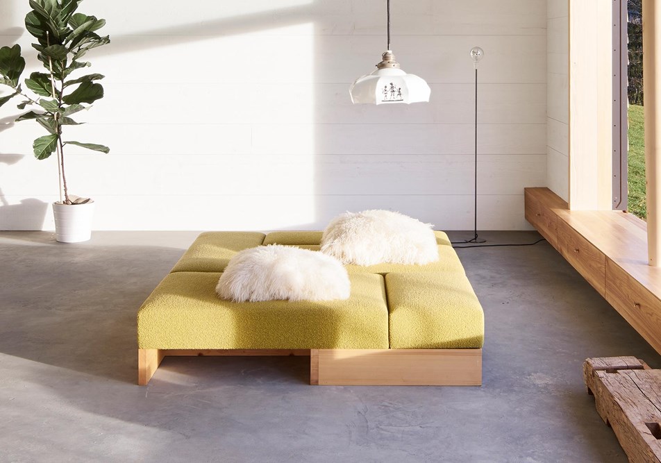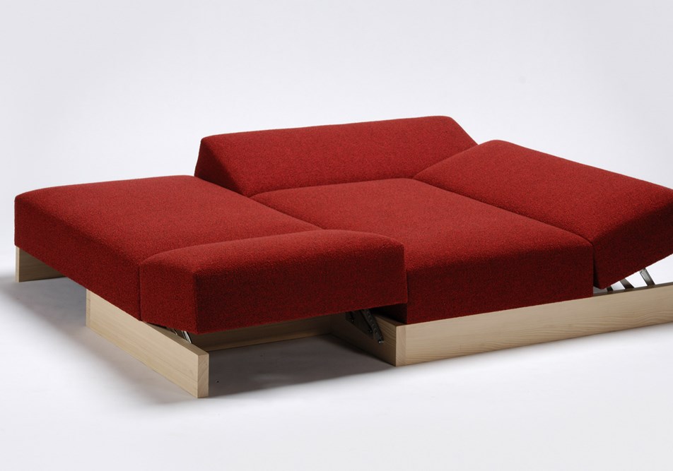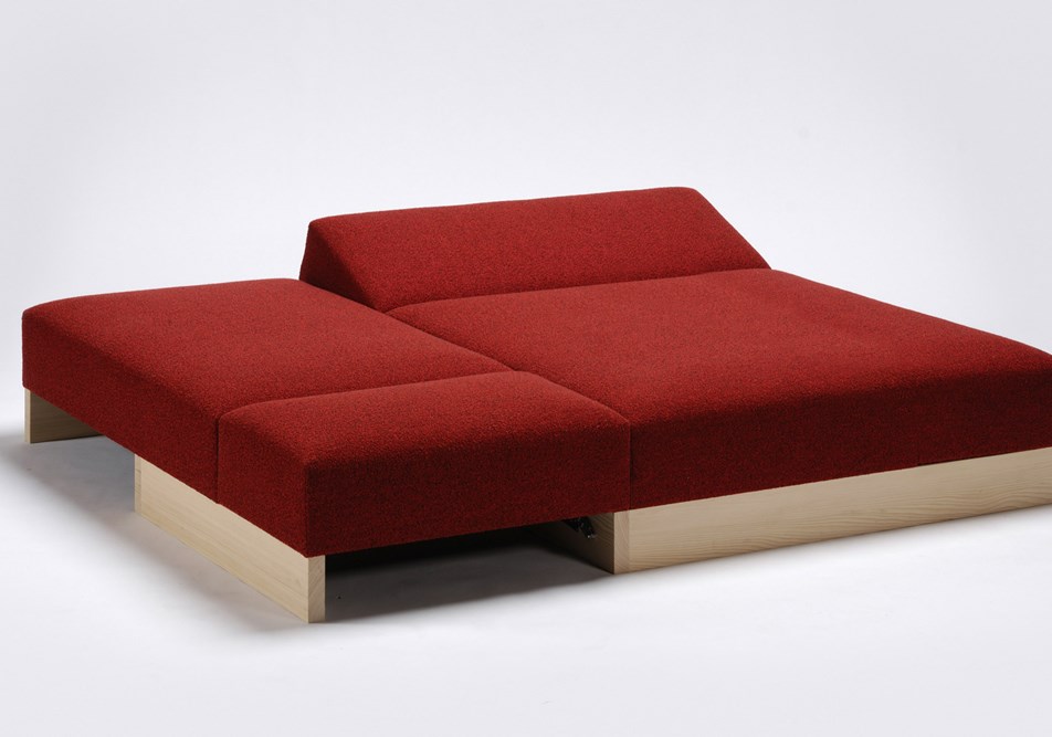 Durch eine weitere Transformation des Typus entsteht eine Fläche die auf kommunikative Gegebenheiten reagieren kann. Sie wird kombiniert mit dem besonderen Sitzgefühl der schwingenden Stahlfedern aus dem traditionellen Polsterhandwerk und dem freien Finden einer gewünschten Position durch verstellen einzelner Polsterelemente.