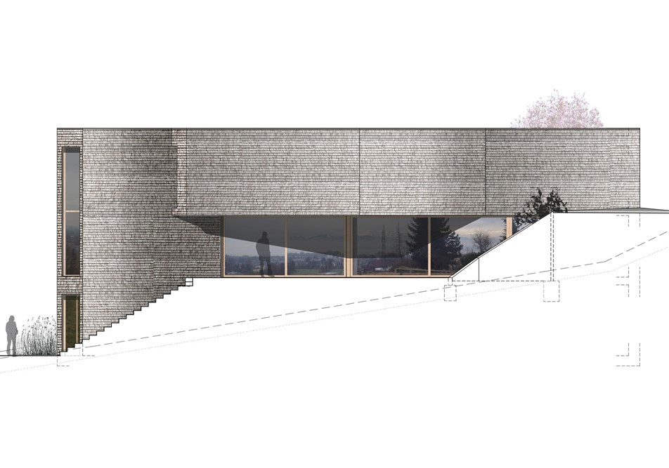 Das Grundstück an der Sonnenhalde liegt an einem Süd-West- Hang mit weitläufigem Blick über den Bodensee von Lindau bis Bregenz, über das Rheintal - bis in die schweizer Bergdörfer im Appenzell. Über eine Aussentreppe gelangt man vom Zugangsniveau im Obergeschoss in die Wohnebene im Erdgeschoss. Hier eröffnet sich eine Wohnlandschaft mit vielfältigen Blickbezügen