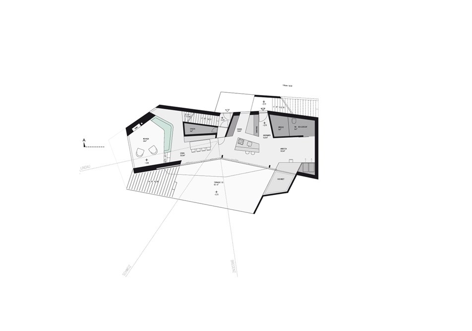Einen besonderen Moment mit einmaligen Ausblick erlebt man in dem überhohen „Kaminzimmer“ mit Panorama- fenster. Das Obergeschoss bietet Rückzug und Intimität - mit geschütztem Wellnessbereich und innenliegendem Lichthof, der die Morgensonne im Schlafbereich einfängt. Die großzügige Terrasse mit breiter Treppe nimmt den Verlauf des Geländes auf und verbindet das Erdgeschoss mit dem Untergeschoss, in dem die Einliegerwohnung weiteren Wohnraum bietet. Die polygone Kubatur ermöglicht in den Verschneidungen verschiedene Ausblicke, Lichteinfälle und Zonierungen, welche den Innenraum im Tagesverlauf in unterschiedliche Atmosphären taucht. Schutz und Intimität resultieren aus der Geometrie und der Verschlossenheit gegen Außen, die offene Raumfolge und Formensprache im Inneren verschaffen im Gegenzug ein Gefühl von Großzügigkeit und Attraktion.